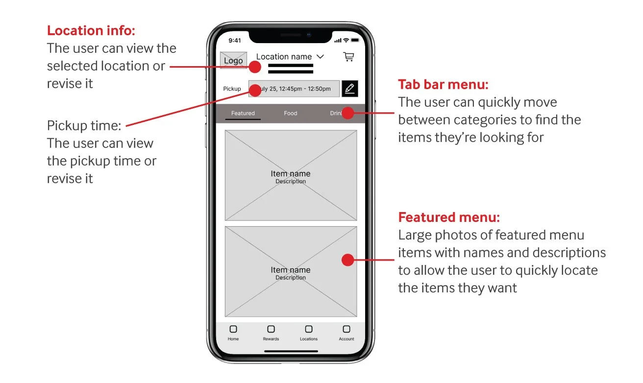 The objective was to design a menu screen with accessible and appetizing photos to entice users. The menu is organized into easy-to-navigate categories at the top of the screen. Additionally, it allows users to revise the pickup time and location directly from the menu screen.