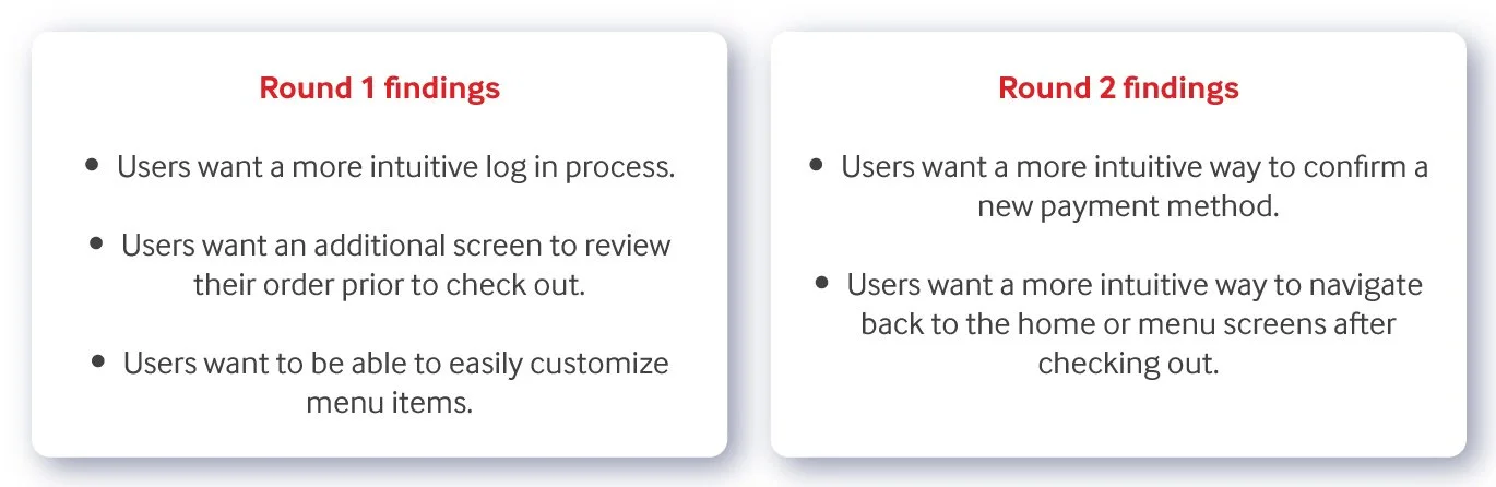 The menu is a key feature of the app and it needed to be inspiring and easy to navigate. I experimented with different layouts , testing various product image sizes and configurations. Ultimately, I chose an option with large, clear product images that would give the user clear, enticing images.