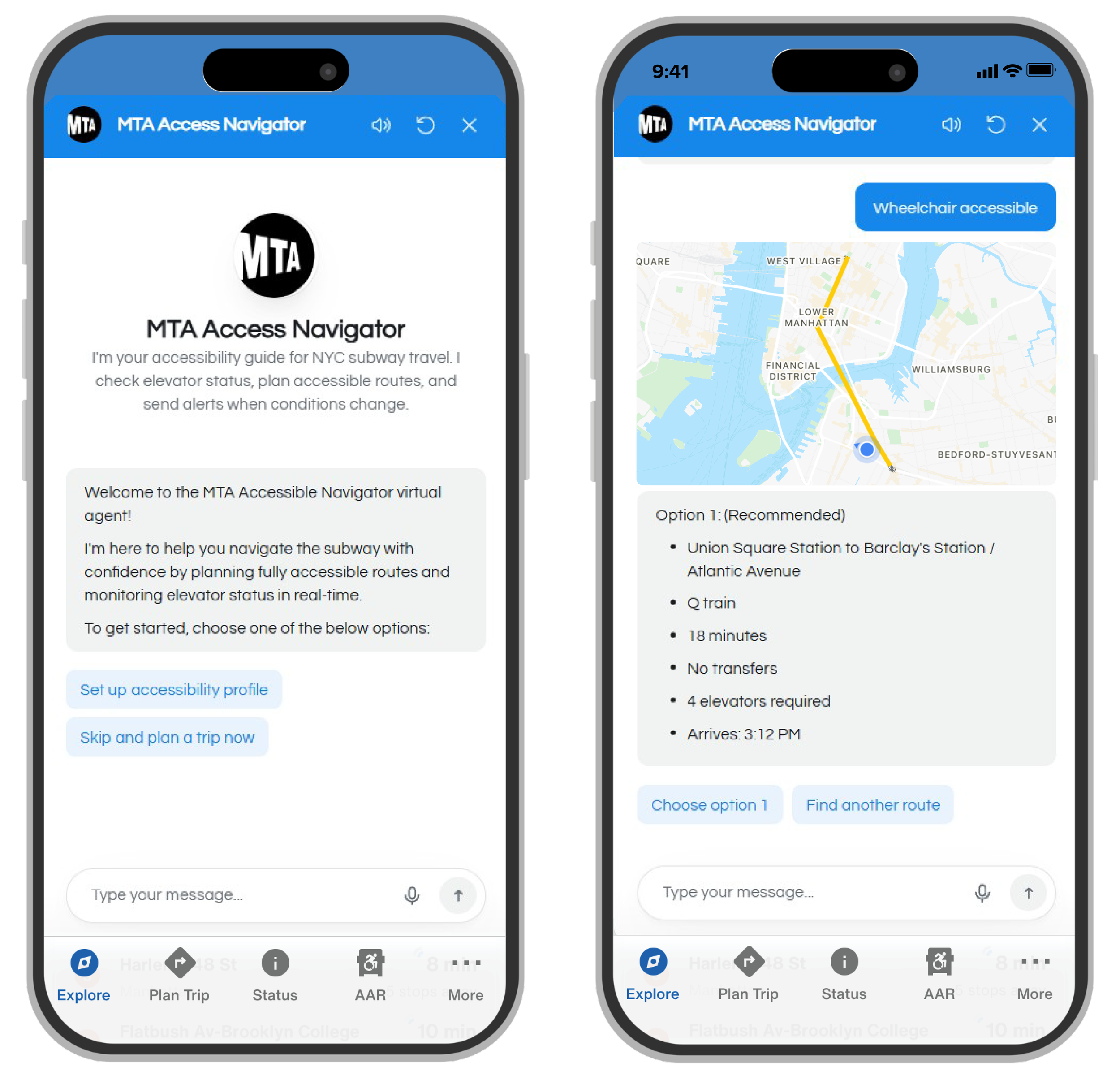 MTA Access Navigator is a smart AI assistant for accessible transit routing integrated into the official MTA mobile app. The chatbot helps passengers with mobility needs navigate the subway system, guiding them along accessible paths with working elevators, escalators, and appropriate accommodations.