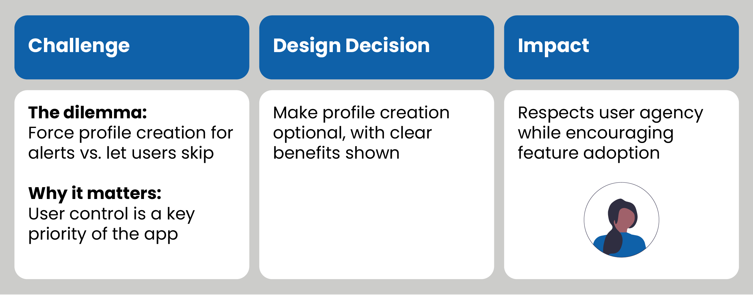 I made accessibility profiles optional rather than required. While mandatory profiles would ensure users receive alerts and personalized routes, they create friction that could prevent people from getting immediate help. It is important to ensure users feel like their autonomy is always respected.