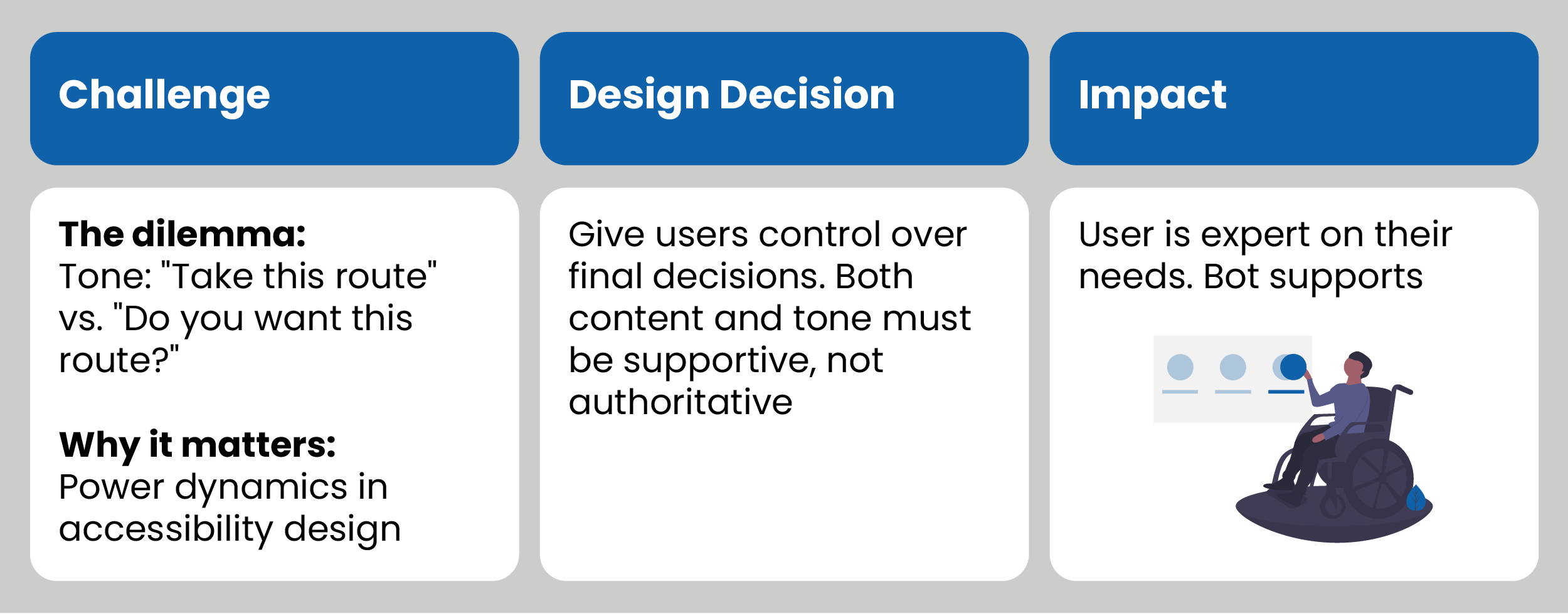 I designed the bot to offer choices rather than dictate actions: "Do you want this route?" instead of "Take this route." Users are the experts of their own needs, and many have experienced systems that control rather than support them. The bot presents options and respects the user's final decision, positioning itself as a supportive guide that empowers independence.