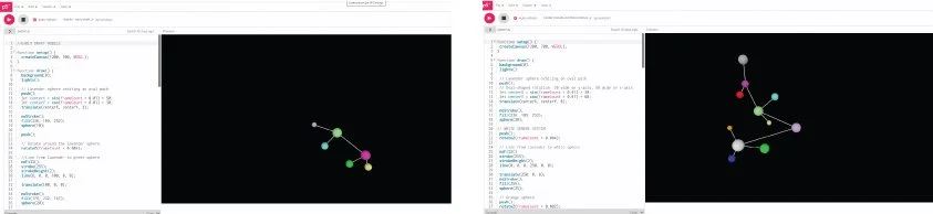 To code the mobile in p5.js, I started by creating a small system of 3d spheres that orbited around a central axis, with all the spheres connected by lines. I then added additional systems of orbiting spheres one by one, and revised the colors, size and placement of the spheres to maximize the size and rotations. Have a look at the final p5.js sketch here.