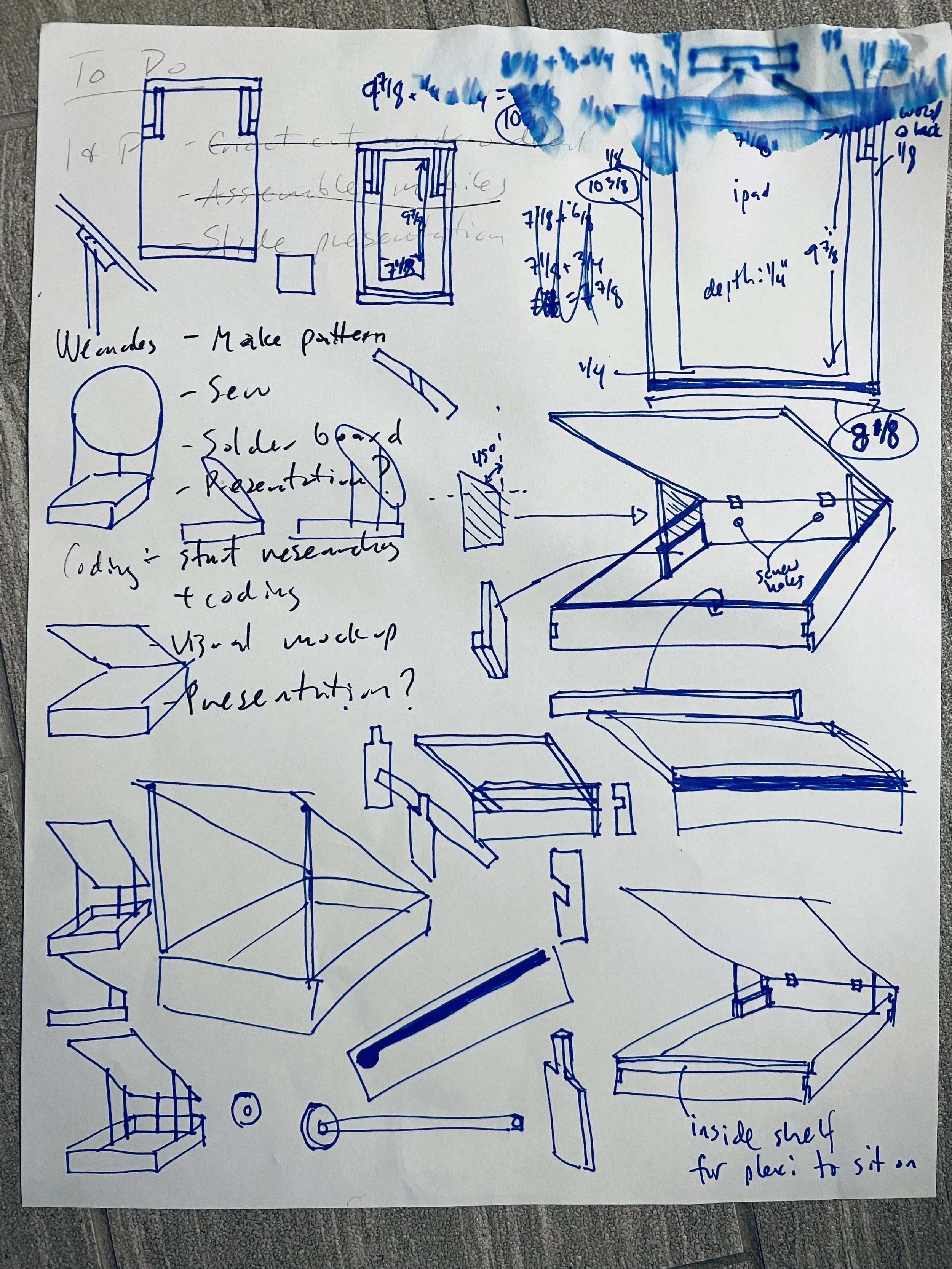 To make the Pepper’s Ghost box, I sketched out a number of different fabrication techniques. I decided to make a laser cut wood box with a rectangular piece of glass angled out from one end of the box. The glass would be held up by clear acrylic wedges along the side. I drew a final sketch in Illustrator so I could fully visualize the whole construction.