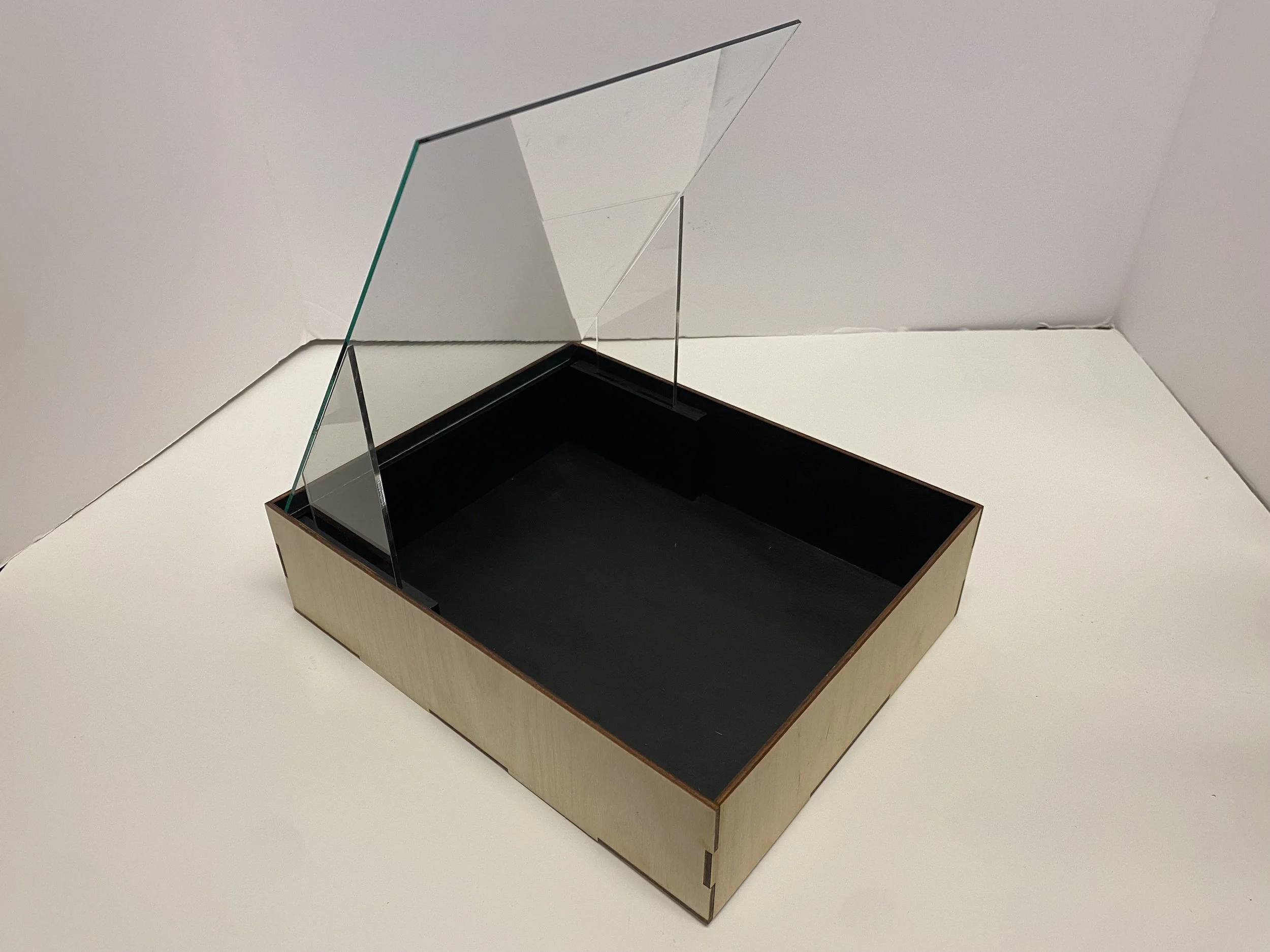 To bring the sketch into the room, and off the computer screen, I decided to build a small Pepper’s Ghost to house the animation. A Pepper's Ghost is an illusion technique used in theater and magic tricks, where an image is reflected onto a transparent screen to create the appearance of a ghostly figure. It relies on lighting and angles to make the reflected image appear as if it's part of the actual space. It’s basically analog augmented reality.
