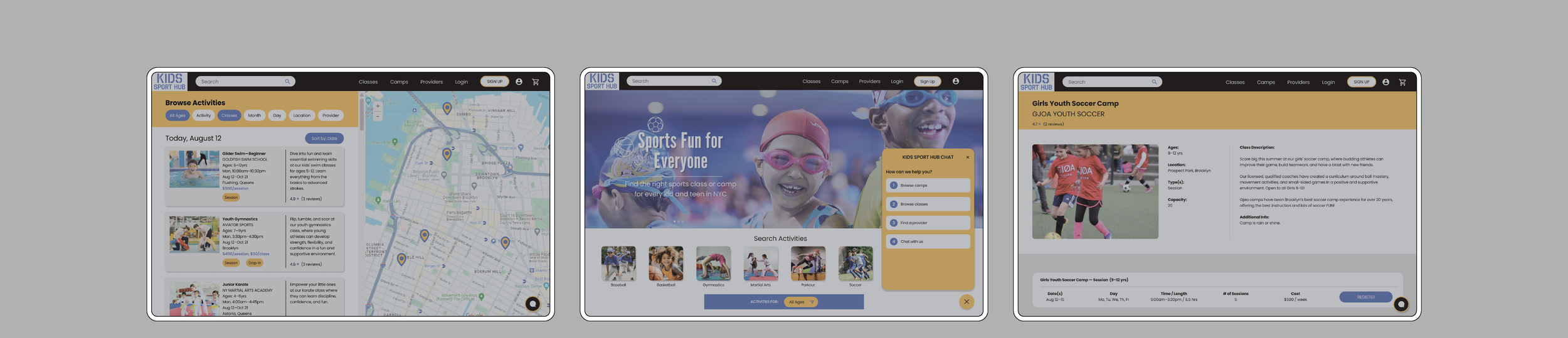 This case study showcases the design and development of a responsive website and AI-powered chatbot created to support NYC parents searching for children’s sports programs. The goal was to build a centralized, user-friendly platform where parents can easily find, compare, and register for activities that fit their family’s needs.